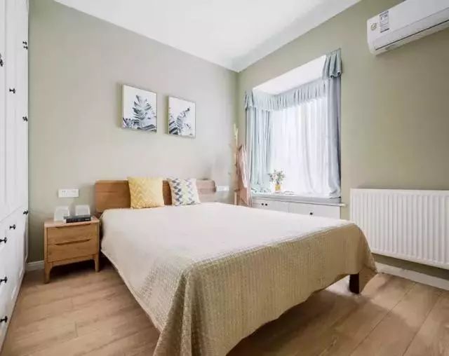 主卧,墙面刷的青灰色墙漆,搭配的原木大床,并以两幅挂画作为装饰,风格清新又素雅;