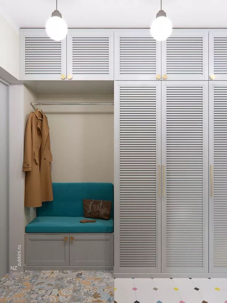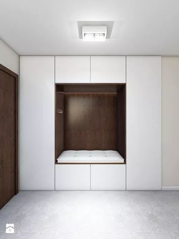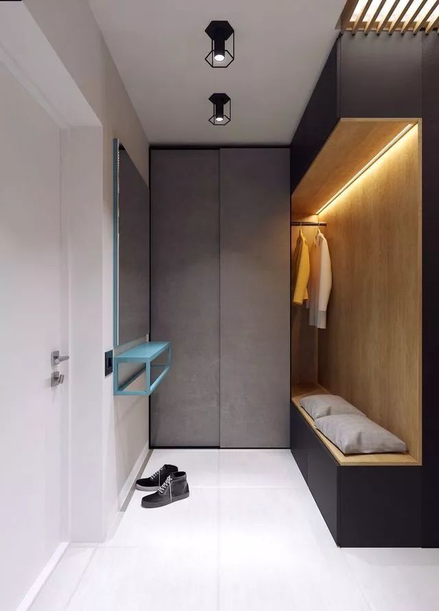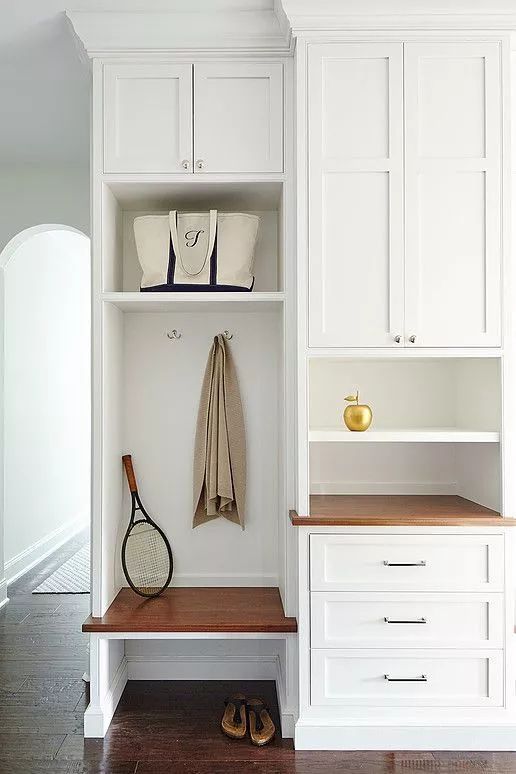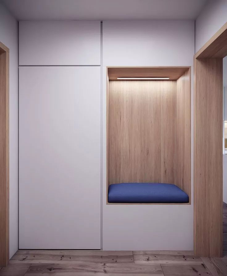嵌入式壁柜是节省空间的利器,它的外观简约大气,内部收纳空间也很充足,你可以设计成半开放+半封闭的形式,让换鞋凳和收纳区融为一体,整个门厅就不会显得又挤又乱了。