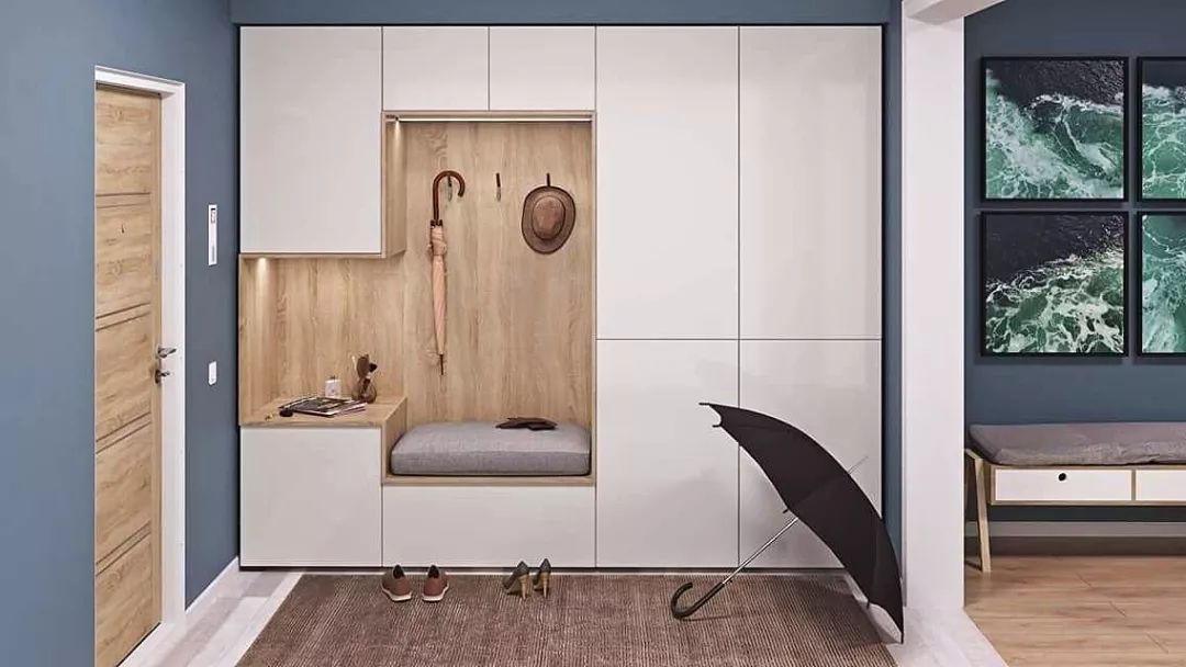 壁柜的深度可以设置在350mm—400mm之间,上方用于储物,下方便于换鞋,如果拥有足够的走道空间,也可以达到400mm以上。