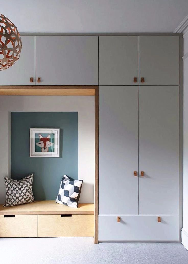 柜子的内部收纳空间,可以不必设计成中规中矩的样式,将悬挂区、吊柜、矮柜、抽屉、隔层等多种元素组合起来,收纳方式更灵活,也大大丰富了空间的层次。