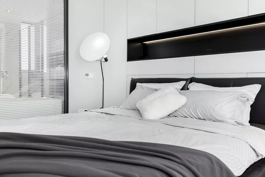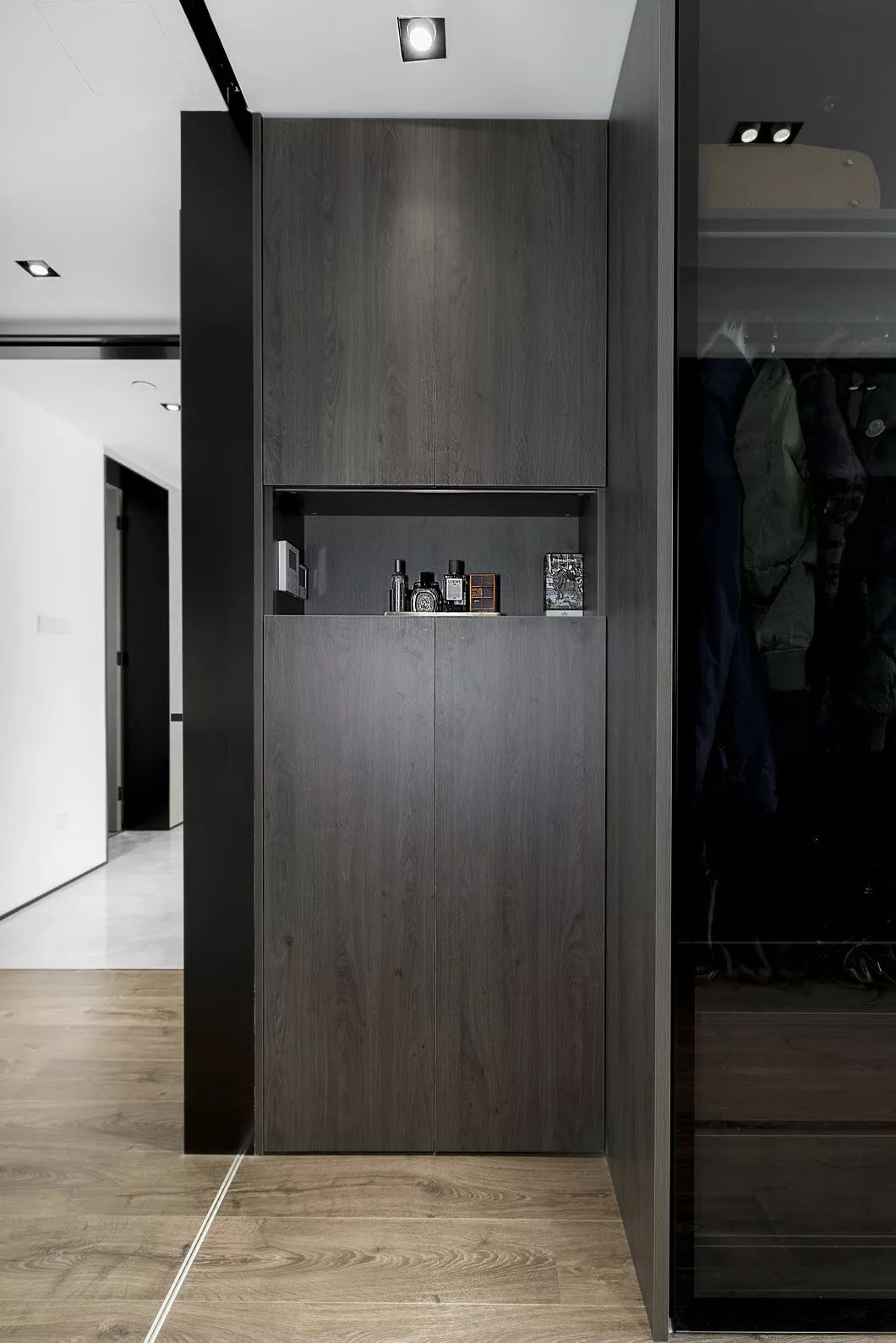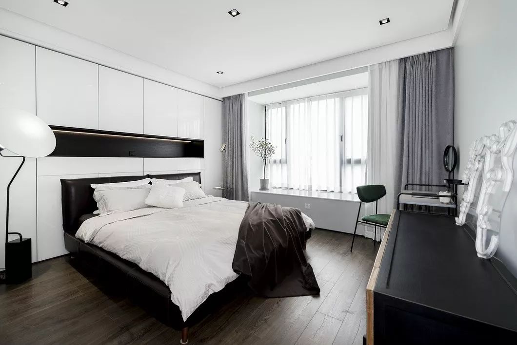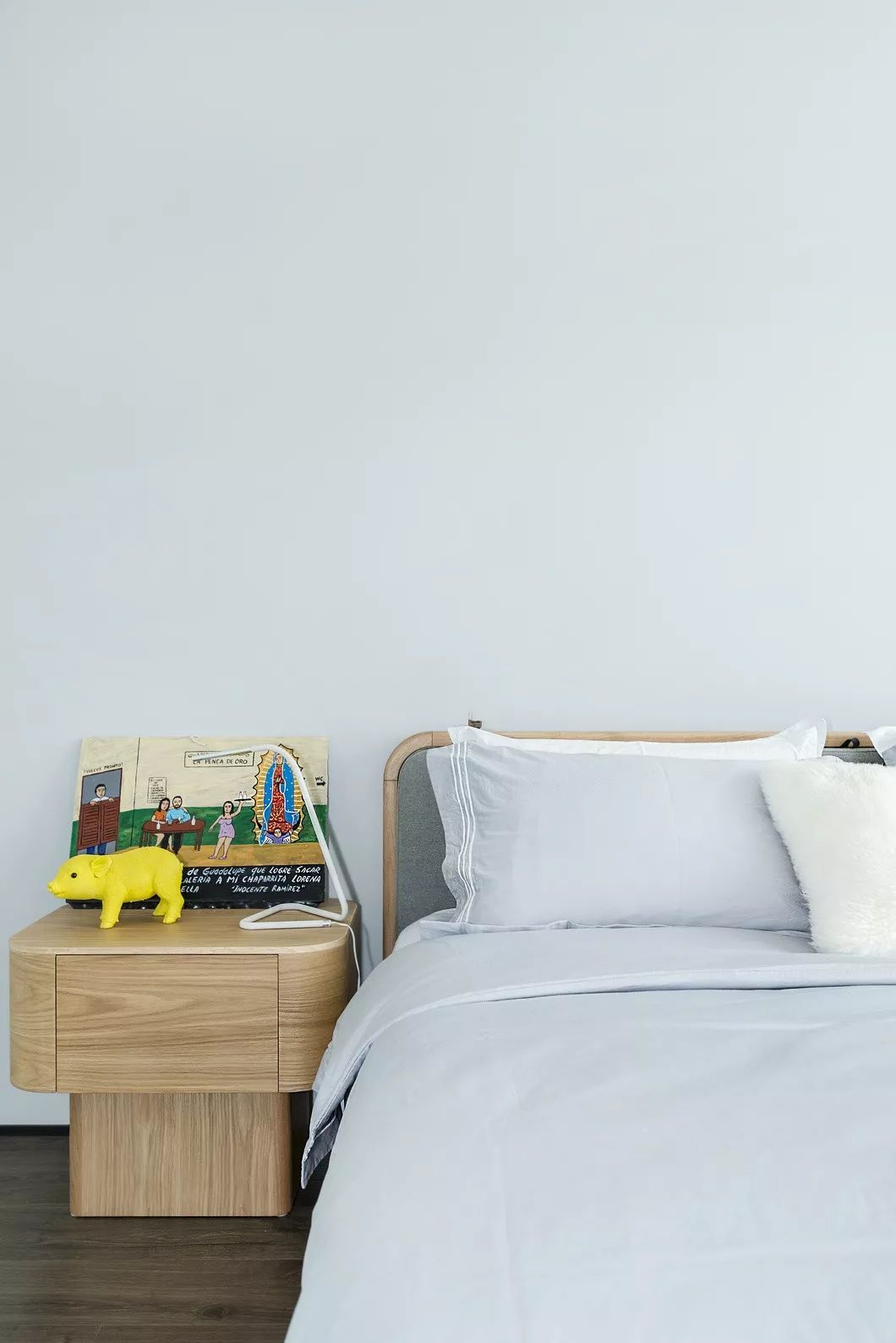 床后的衣柜用设计最初平面构成的方式并加以光滑的白色烤漆柜门板形成规则的几何图形,简约中自有一种率性与质感。