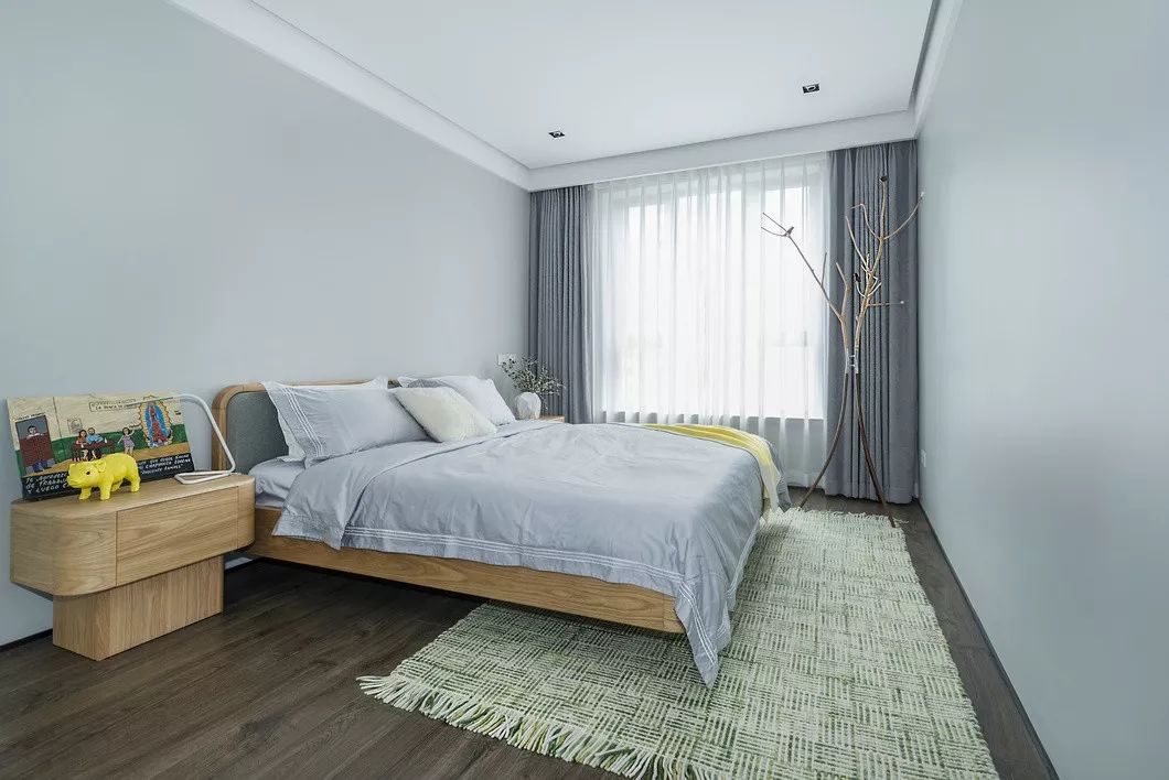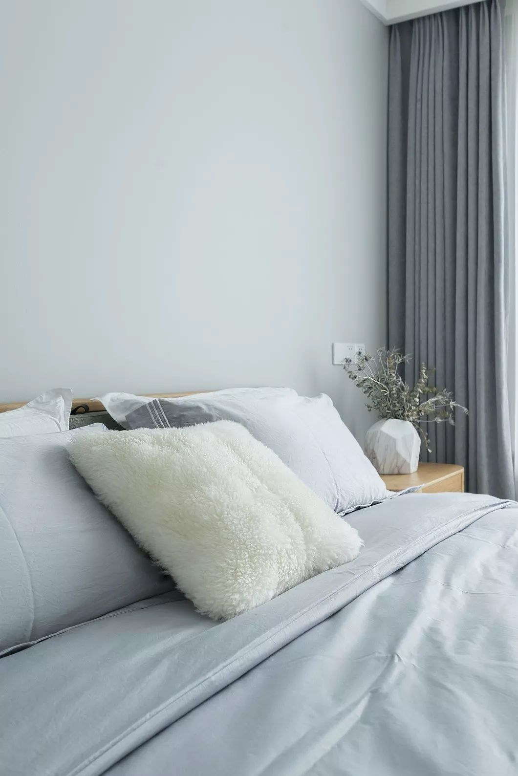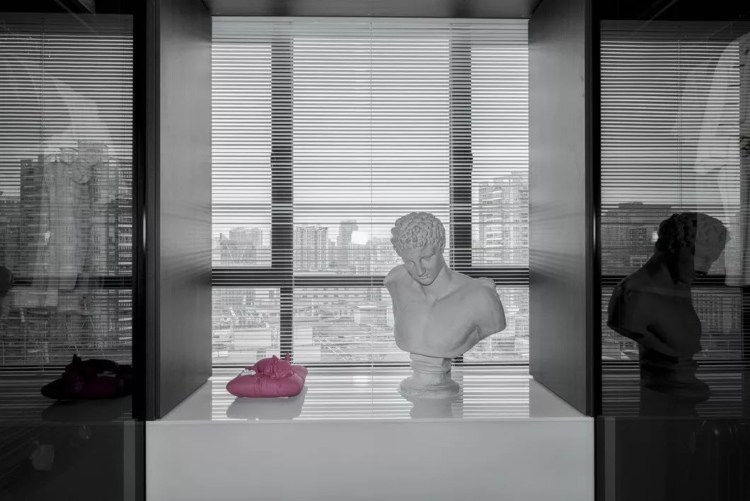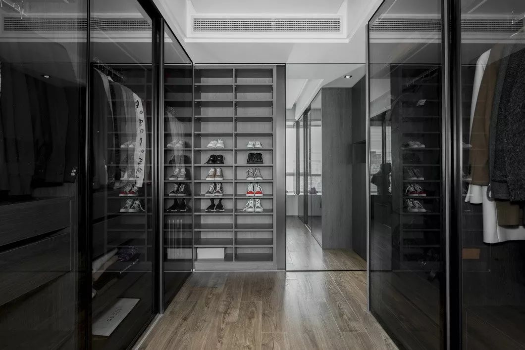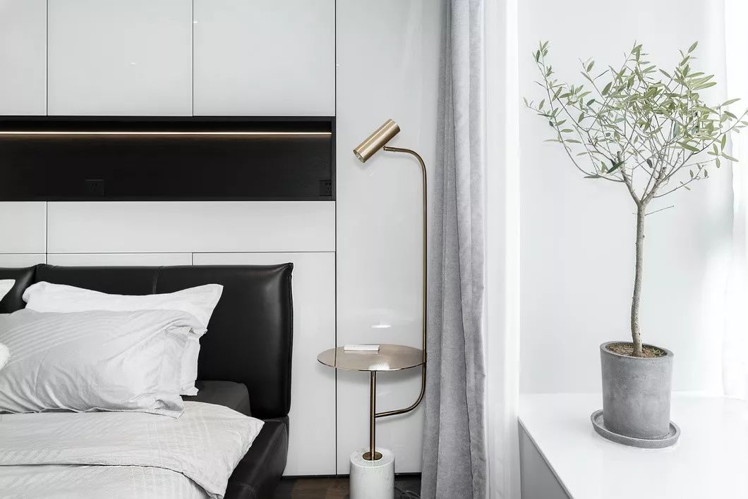 床后的衣柜用设计最初平面构成的方式并加以光滑的白色烤漆柜门板形成规则的几何图形,简约中自有一种率性与质感。