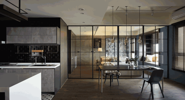 设计师更在独立厨房的连接处设计多功能L型吧台,并采用玻璃作为隔间,防止油烟溢散却不减通透度。