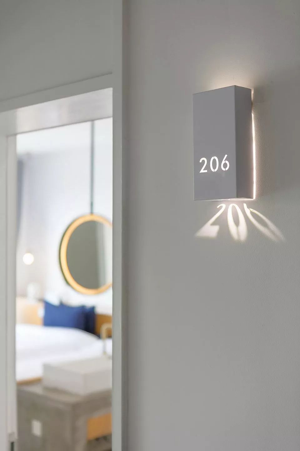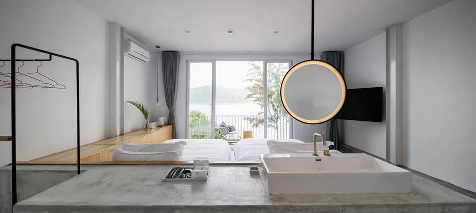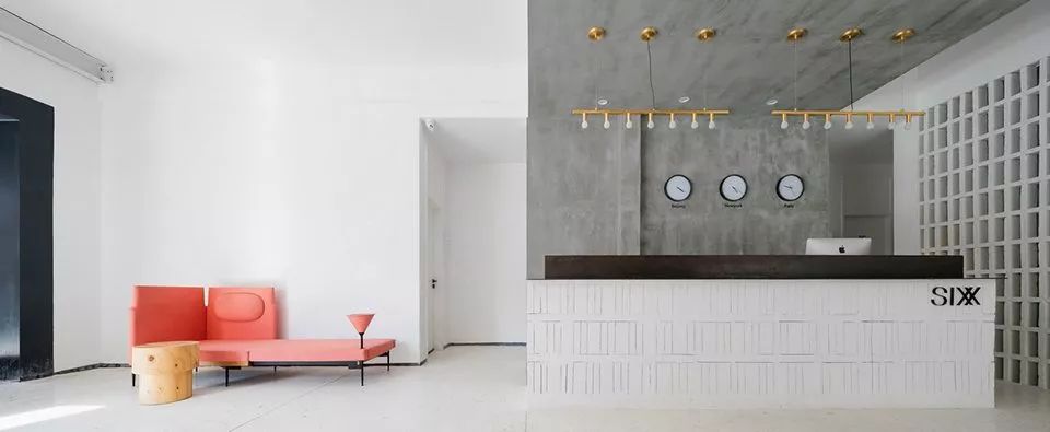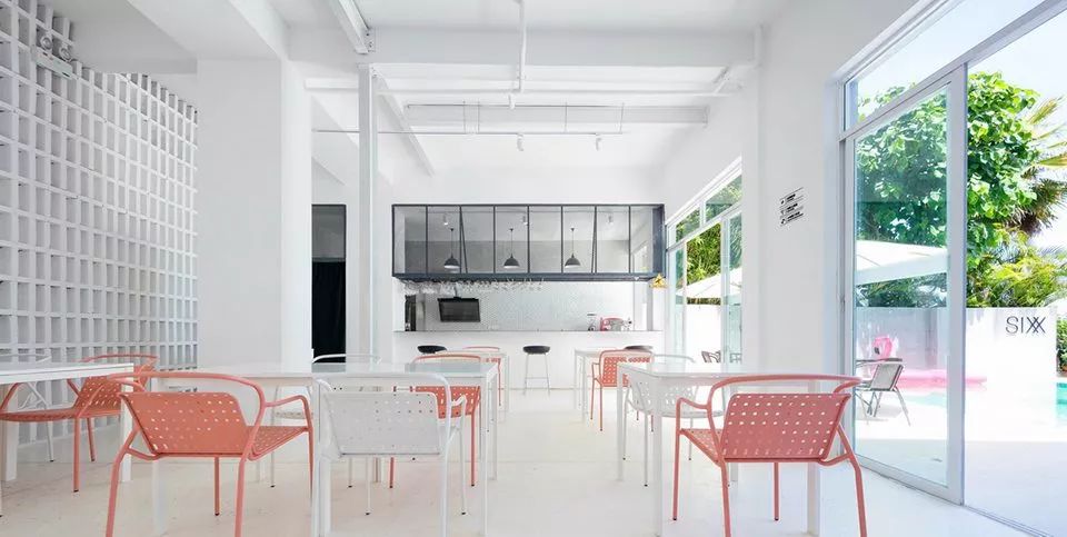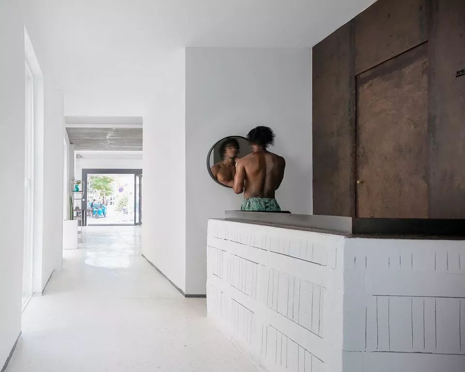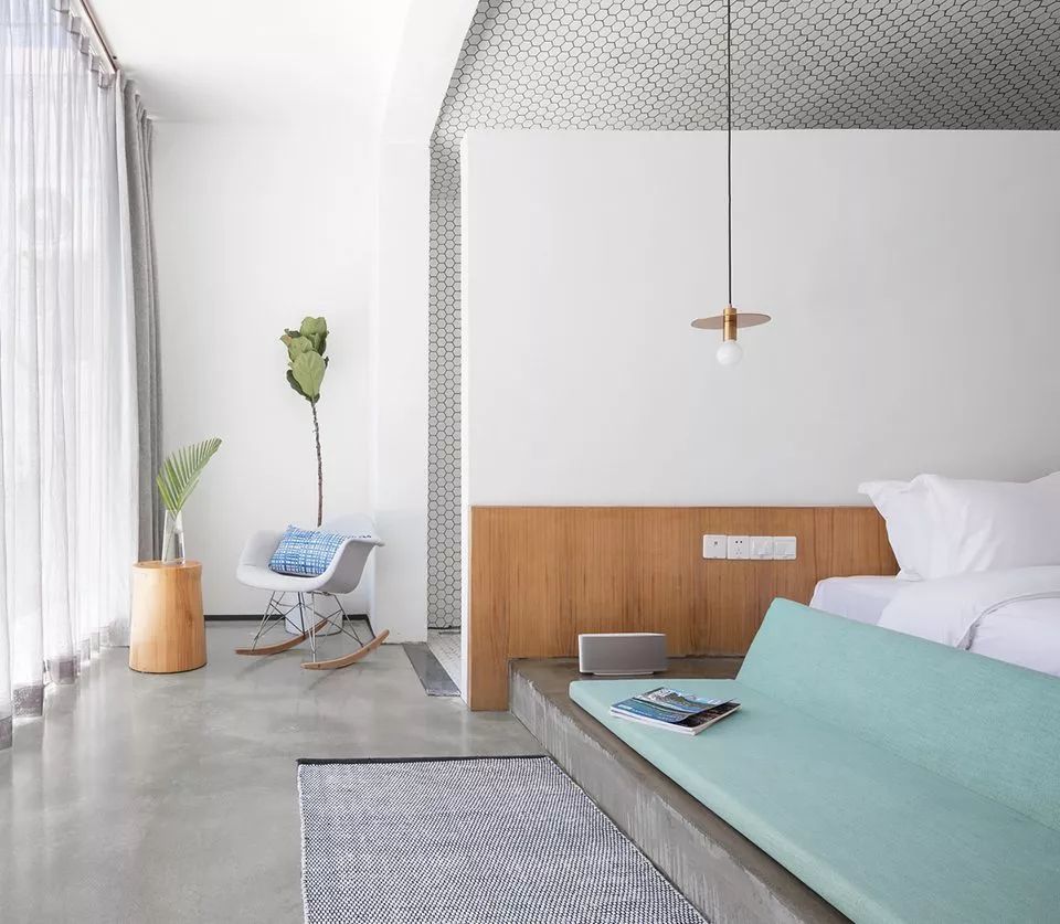 室内空间以白色、海洋元素为设计基调,局部结合白色马赛克、清水泥、水曲柳原木饰面以及黄铜等材料元素。建筑师在来营造这样一个清新、纯净的空间的同时,室内陈设配上了多样的热带绿植、色彩亮丽的冲浪板、以及浅粉色系的家具。整体室内空间的设计风格非常契合酒店的年轻、休闲、热情、以冲浪文化为主的气质。