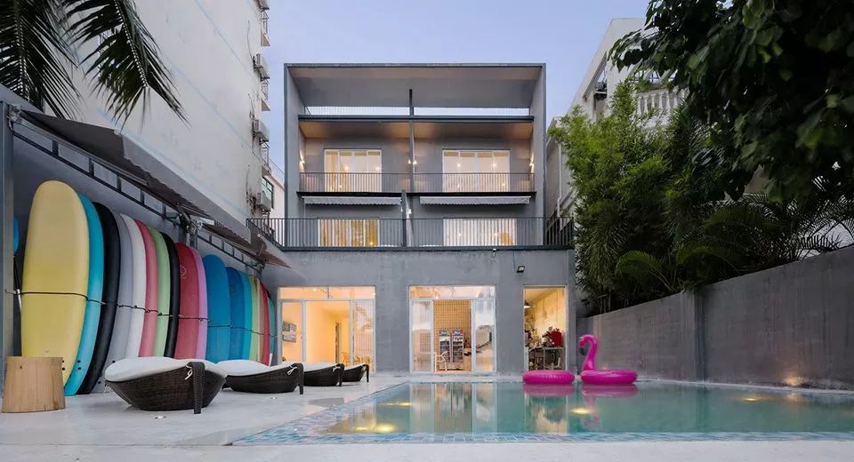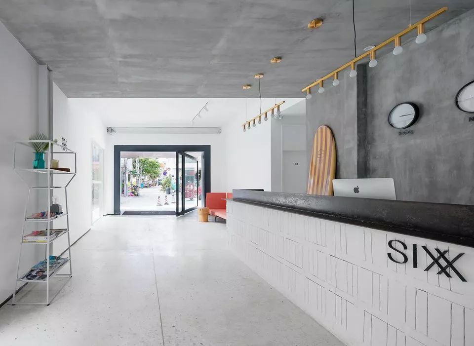 三亚·六甲酒店(SIXX Hotel)位于海南省三亚海棠区后海村,酒店门前正对的是后海村街道,酒店背后紧邻沙滩,从酒店建筑通往海滩距离10米不到。酒店原是一栋三层的当地渔民的自用住宅楼,建筑师通过结构加固、空间改造,将原有民宅改造成以冲浪为主题的度假酒店。