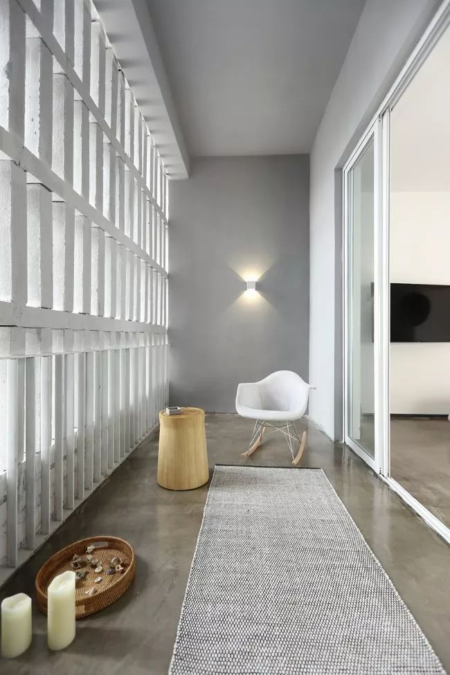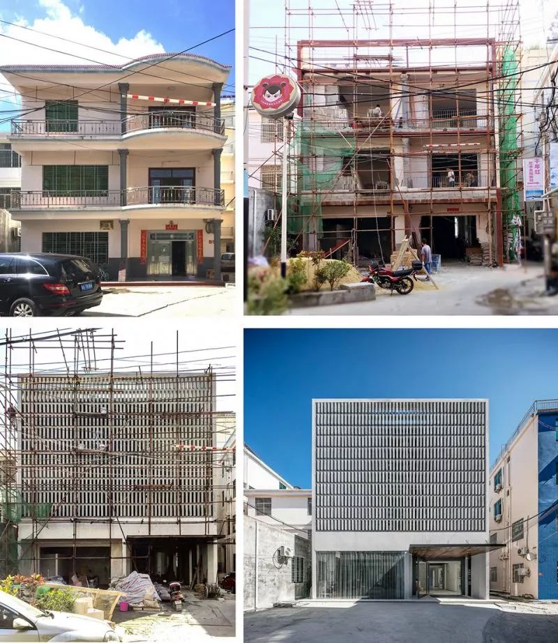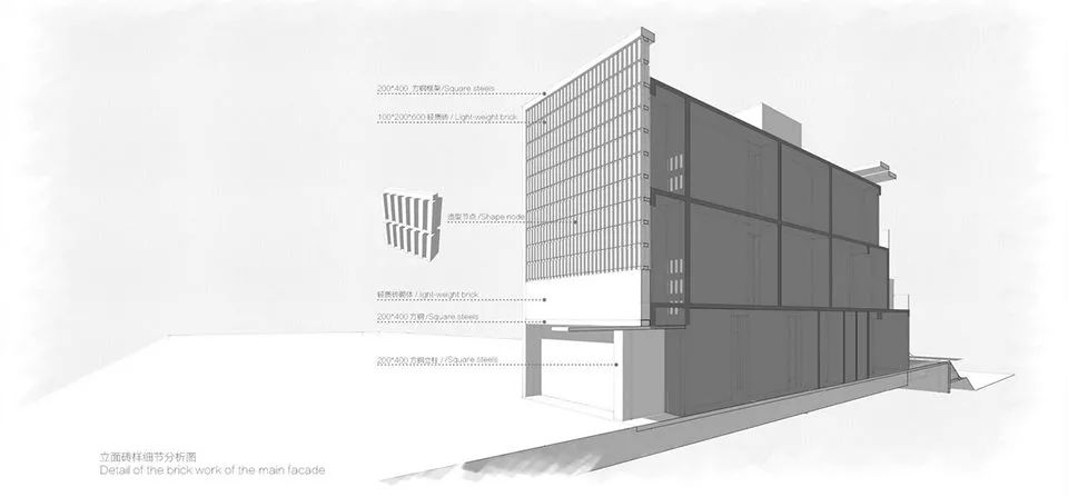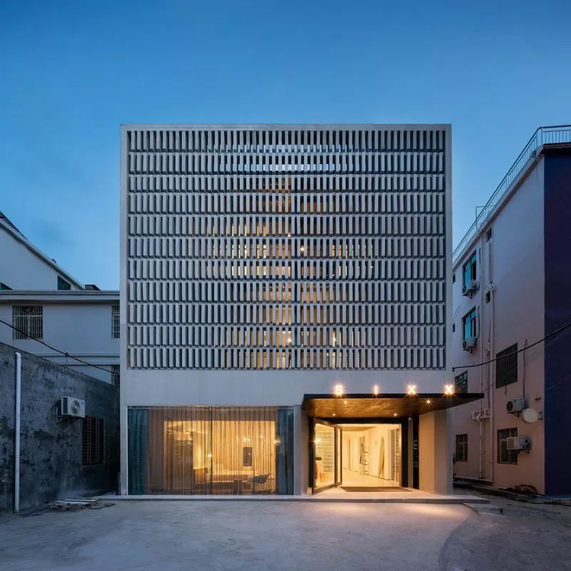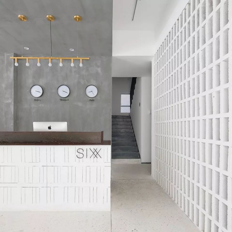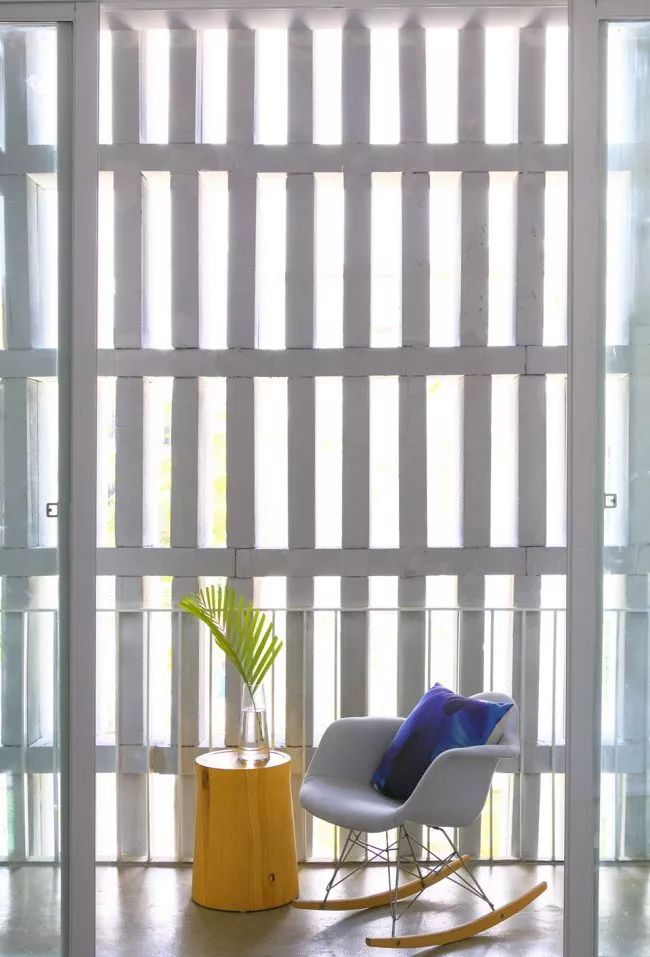 对于面朝繁华后海村街道的建筑主立面,我们将原有建筑的弧形阳台进行了拆除,建筑外形轮廓被还原成简洁的方形。另外,建筑师将550块水泥轻质砖用阵列堆栈的方式将建筑正立面完整的遮掩起来,这样既保证了沿街客房阳台的私密性,又解决了正立面下午西晒的问题,同时提升了整体建筑的气质。