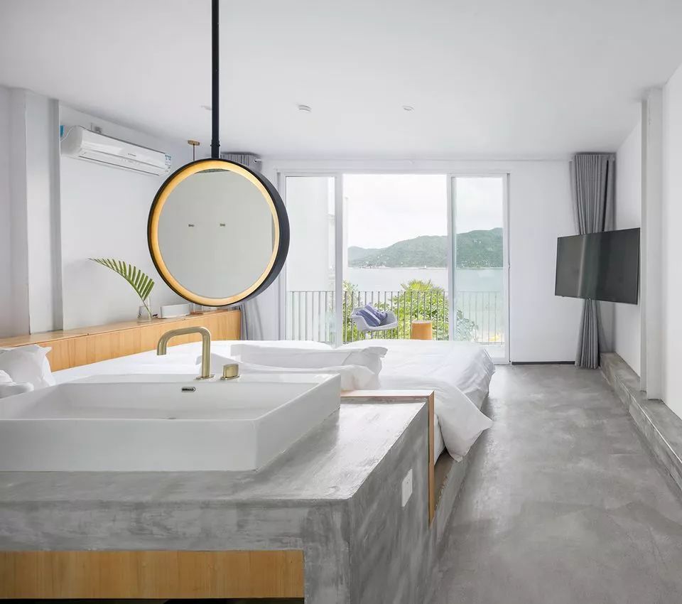 穿过一层开敞的公共区域,是面朝大海的无边泳池,这个无边泳池是由原建筑的养虾池改造而来。面朝大海的还有两层四间客房,建筑师通过外部立面上加固的钢结构,将原有建筑狭窄的阳台改造成了能够观赏海上日出日落的露台。
