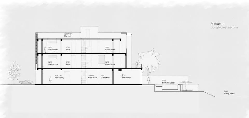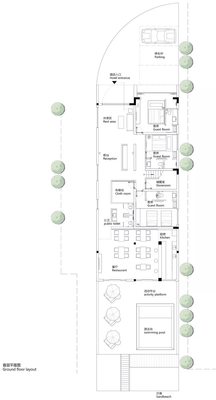原建筑为当地人一家四口居住,因其对于居住条件要求不高,室内空间分区随意且不合理:建筑西北面开窗巨大,一来正对后海村街道非常嘈杂,二来下午西晒严重;建筑东南面正对沙滩,开窗太小,影响室内采光和视线;一层沿海平台原有通往二层的室外楼梯严重影响采光,并造成一层室外空间的流线混乱;建筑一层空间拥堵,没有设置开敞的公共空间;不适合酒店的功能需求。