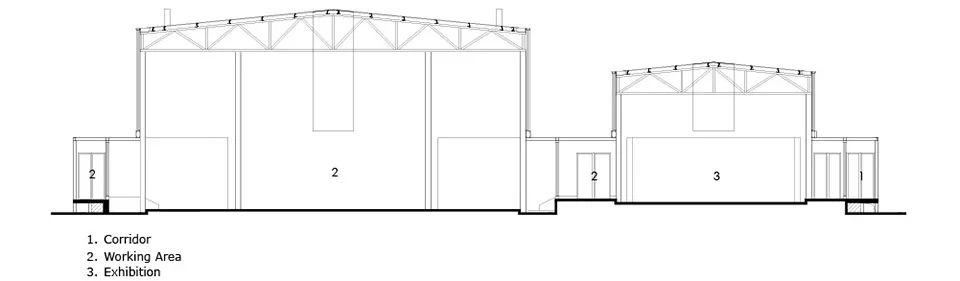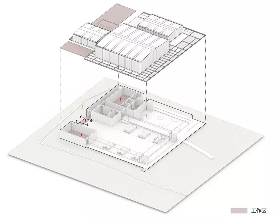 红糖工坊建筑体量分为南北两部分,北侧与甘蔗地相邻由红砖围合,成为甘蔗堆放和后勤服务区,南侧向村庄与田野打开,成为开放的红糖生产展示区。三个挑高的轻钢体量分别作为:休闲体验区,甘蔗堆放区和带有六个灶台三十六口锅的传统红糖加工区。环绕这三个区块的线性走廊,成为红糖生产剧场的环形看台和参观流线。