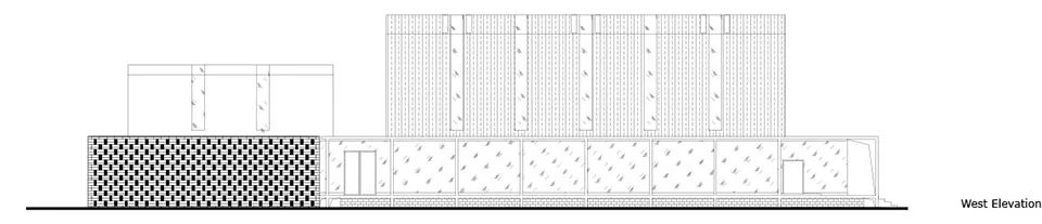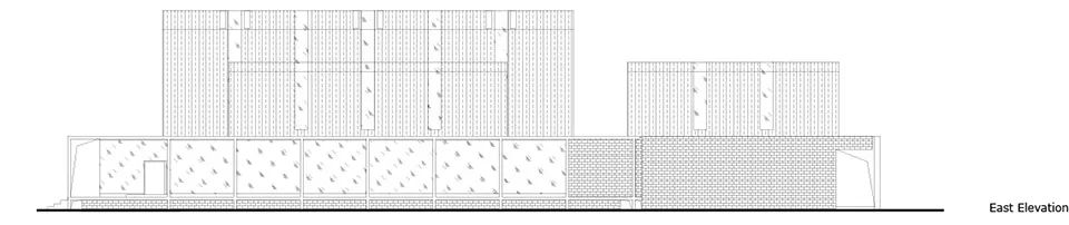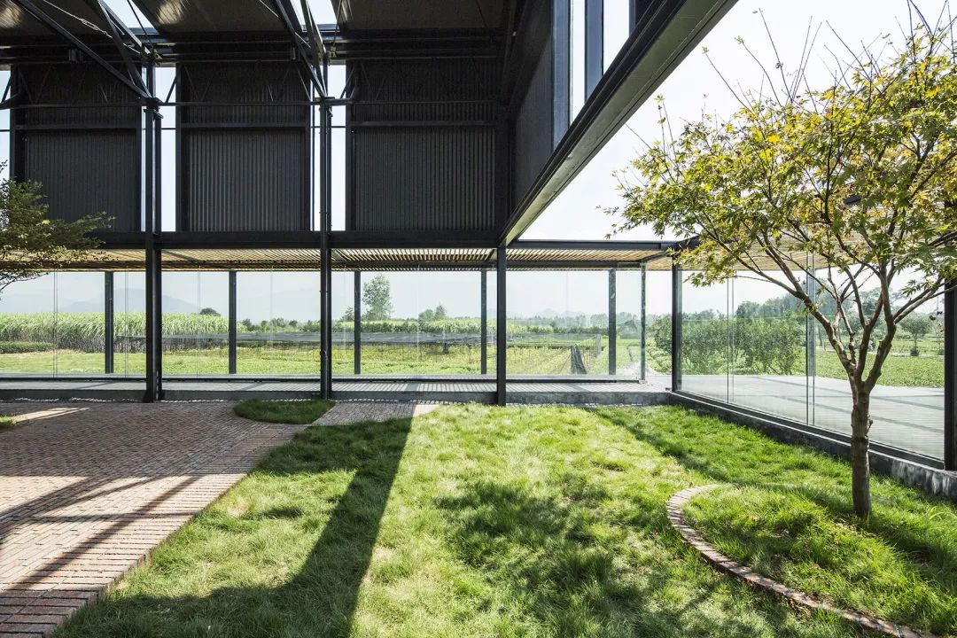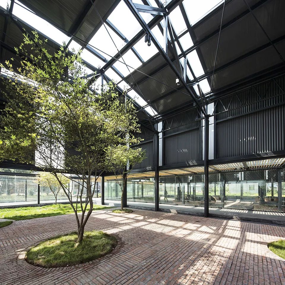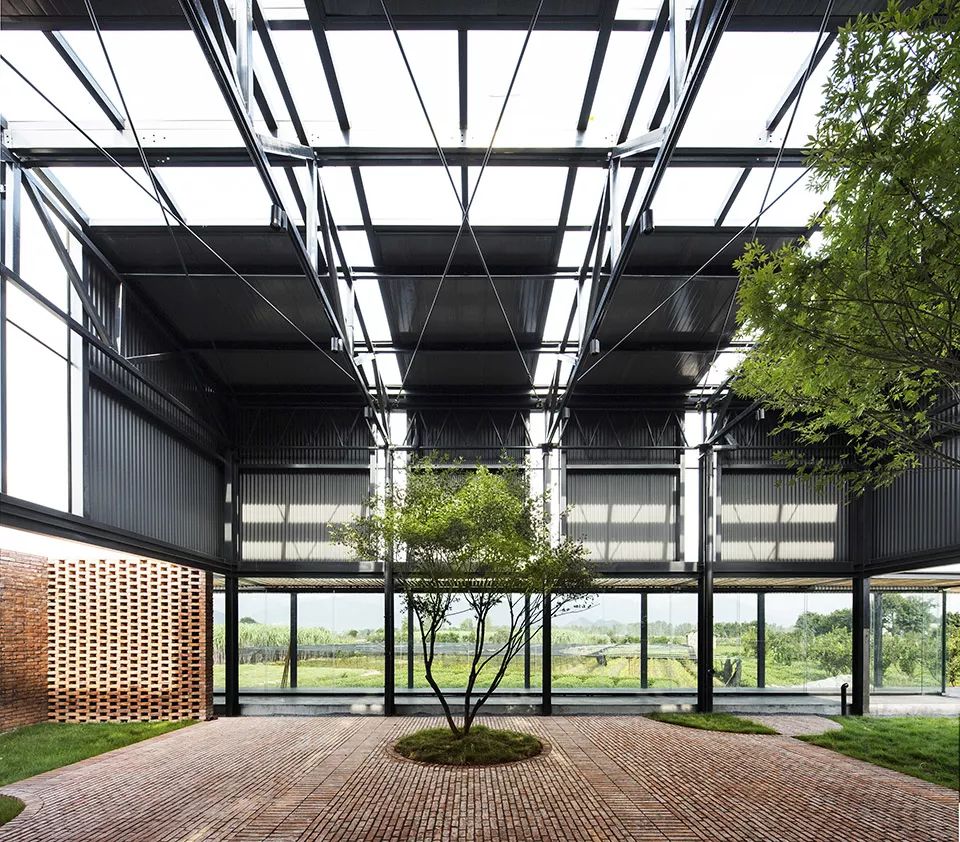 红砖是乡村随处可见的建筑材料。北侧后勤服务区用红砖作为封闭的围护体系,与生产展示区结构脱开,和功能的属性相对应。部分非结构的墙面作镂空处理,既可保证私密性,又可在视线上与外面自然景观相连。