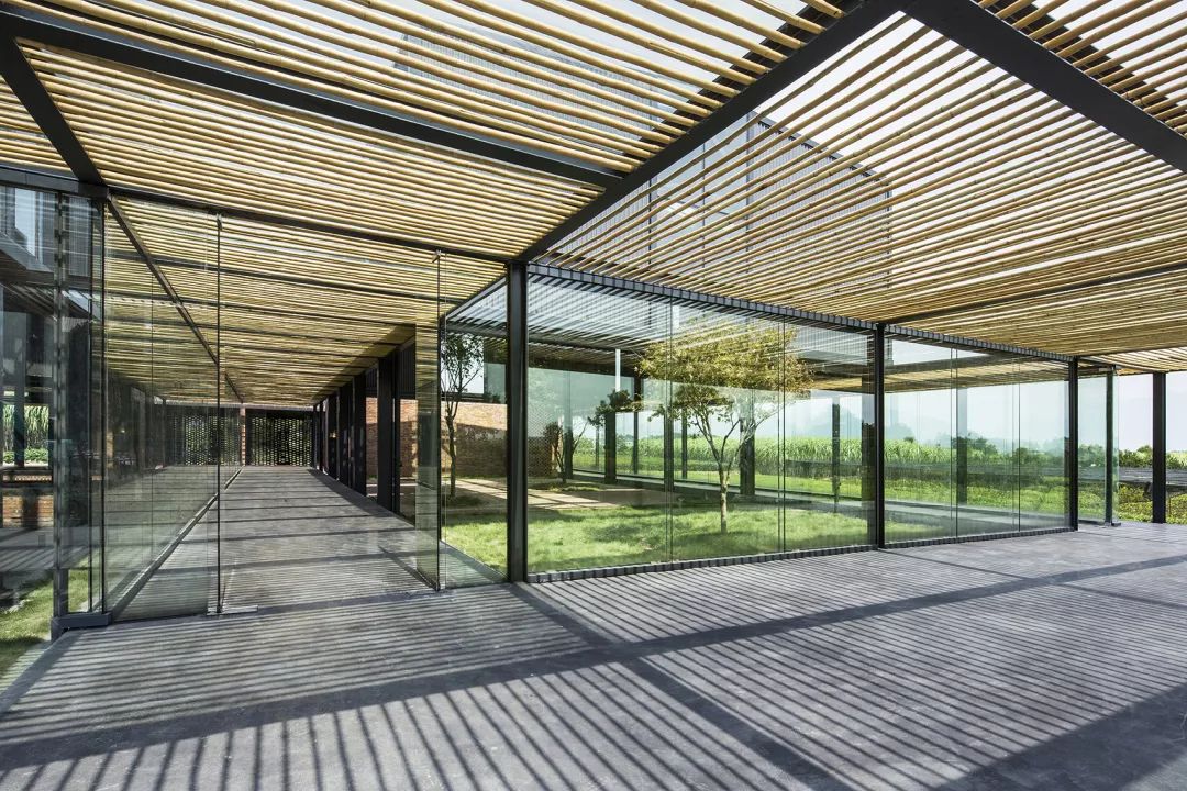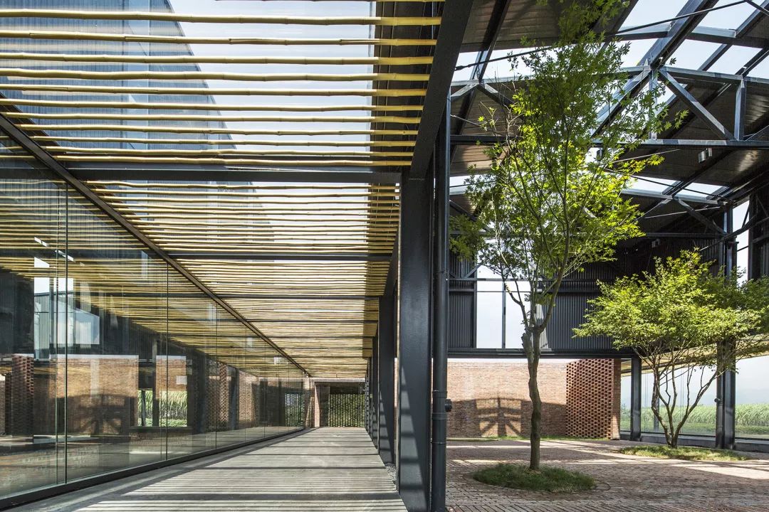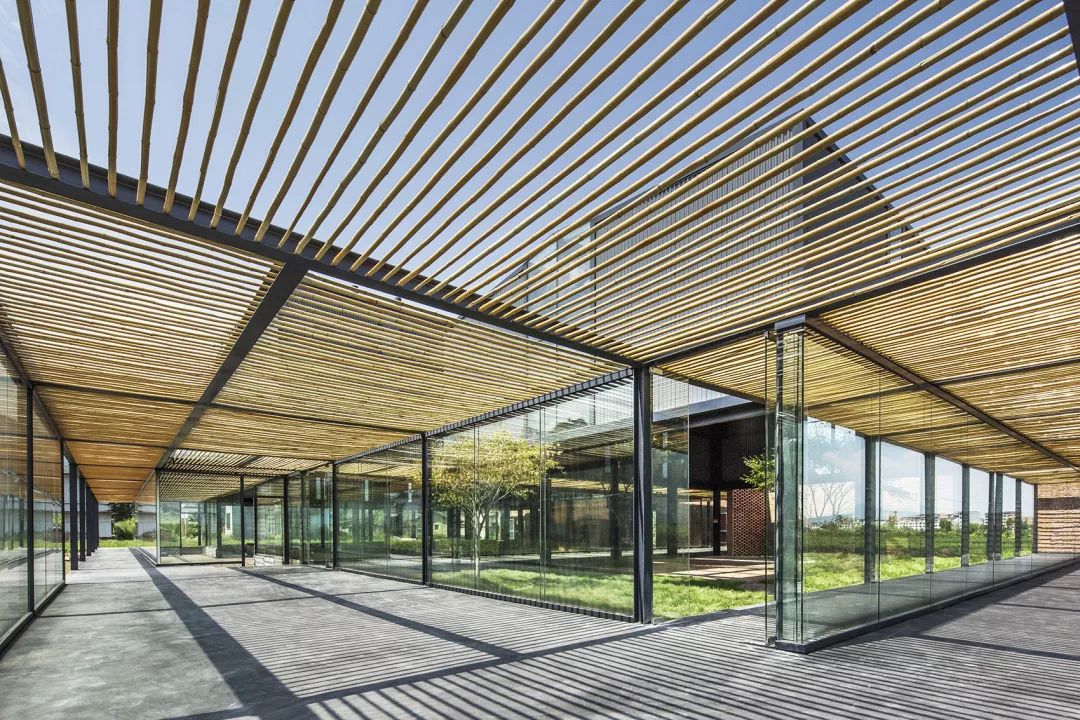 竹子作为当地常见的建筑材料被引入设计,作为生产展示区环形游廊的顶面材料界定空间范围。纤细的竹条整齐的排列成格栅,不仅提供遮阳作用,也强调出“灰空间”的半室外的属性。