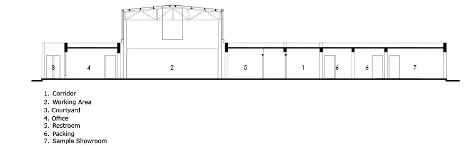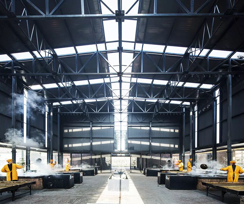 红糖工坊这样规模的小厂房,在松阳的平地村并不罕见。通常都采用经济有效的轻钢结构;在红糖工坊的设计中,我们选取当地常见的这种轻钢建筑形态,符合大跨度生产空间需求, 与工厂的功能属性吻合,结合空间功能属性区分使用,形成清晰的材料结构系统。由于古法红糖制作需要使用明火,烟囱、排风等设备也在设计上整体可虑和轻钢结构融为一体。轻钢结构灵活的特性可以在生产展示区视线范围完全打开,作为开放的公共空间,与村庄和田园相连,互相叠加成为富有生机的田园生产生活画卷。