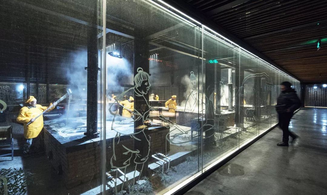 受到当地村落随处可见的白描文化墙启发,我们邀请艺术学院的学生们在红糖工坊内外的玻璃幕墙上手工白描《山水风景》、《田园农耕》、《甘蔗种植》、《甘蔗运输》、《古法红糖》五个篇章的画面,展示红糖制作流程,使建筑界面与外部的田园风光、农民生产生活画面和内部的古法红糖生产过程,多重叠加成一幅动态的乡村长卷。白描画面让四周的玻璃呈现一种幕布般的错觉,再次强调红糖生产的舞台感和表演感。