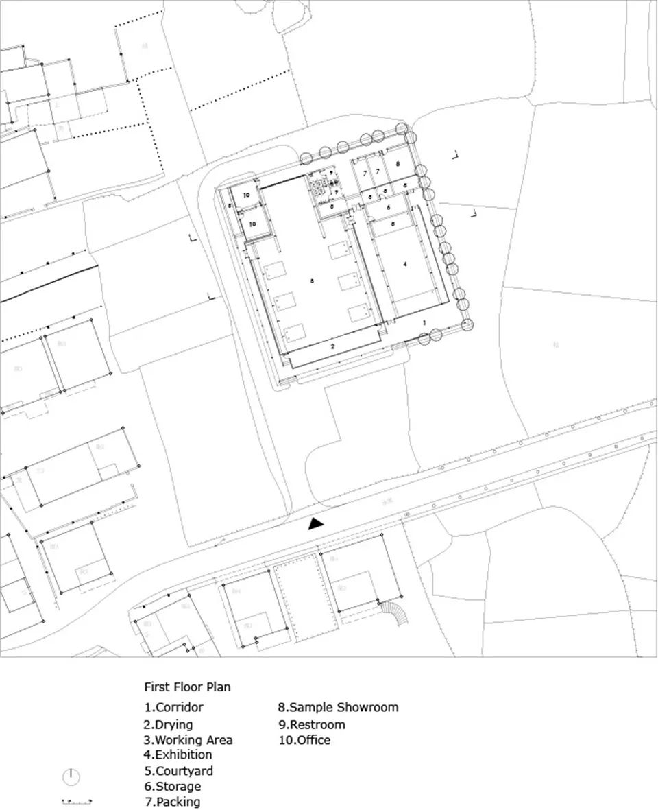 生产展示区用红砖铺地,与黑色的轻钢棚架脱开,和红糖颜色呼应。加工区地面将田野中田埂的线条延伸入室内,用不同的红砖砌法加以区分。展示区则由红砖结合绿化设计,增加空间丰富性,强调展示区作为公共休憩空间的功能属性。围绕生产展示区的游廊则用水泥铺地,界定空间,体现空间的流动性和室外性。后勤服务区块用深色水泥铺地,与红色的墙面体系区分,颜色上压住空间。