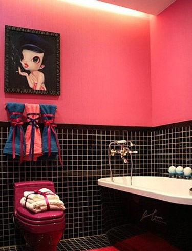 粉粉的少女心,也是一种不错的选择哦,灯光设在四周,保证空间的灯的亮度,同时又增加一些设计感,上面四周用粉色装饰,下面四周用黑白网格装饰呼应,既不显得整体粉色太重,又能体现粉色的冒泡的感觉。墙上用画来装饰,不显得空间空,单调。