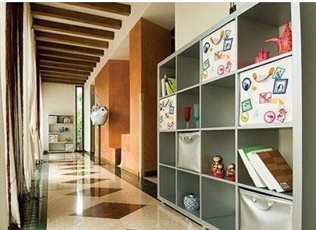 走廊足够宽敞,大可以摆入这样宽宽大大的储物架,储物盒上的卡通图案,增添了走廊的青春俏皮感。走廊图书馆