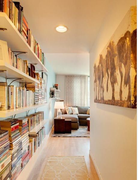 对于书多的人,装个搁板,利用走廊空间,让空间藏书量增大,空间更有墨香内涵。衣帽间
