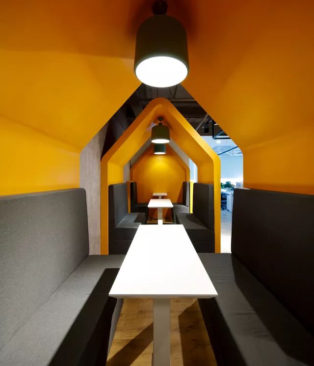 比如亮橙色开放会议间与品牌VI的脏灰色搭配。