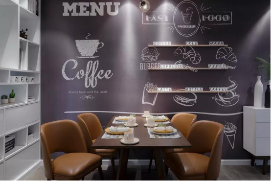 ▲ 餐厅的设计感非常强,只这一面黑板墙就让餐厅看起来超级有格调,小情调满满,更何况还有一面到顶的书柜。