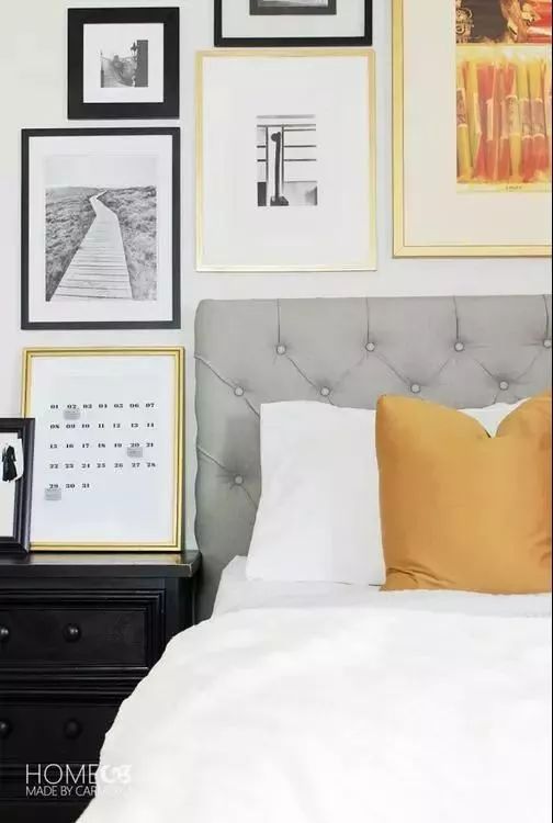 ▲簇绒床头板显得大气与高贵,搭配照片墙很有艺术感。