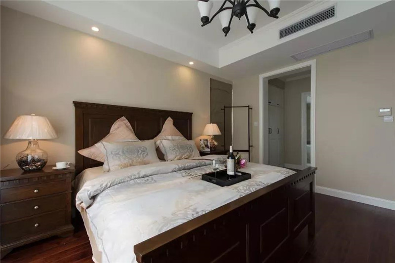 ▲通铺深沉的木地板,淡淡黄绿色的床头背景墙,搭配深棕色沉稳端庄的家具,精致得优雅。