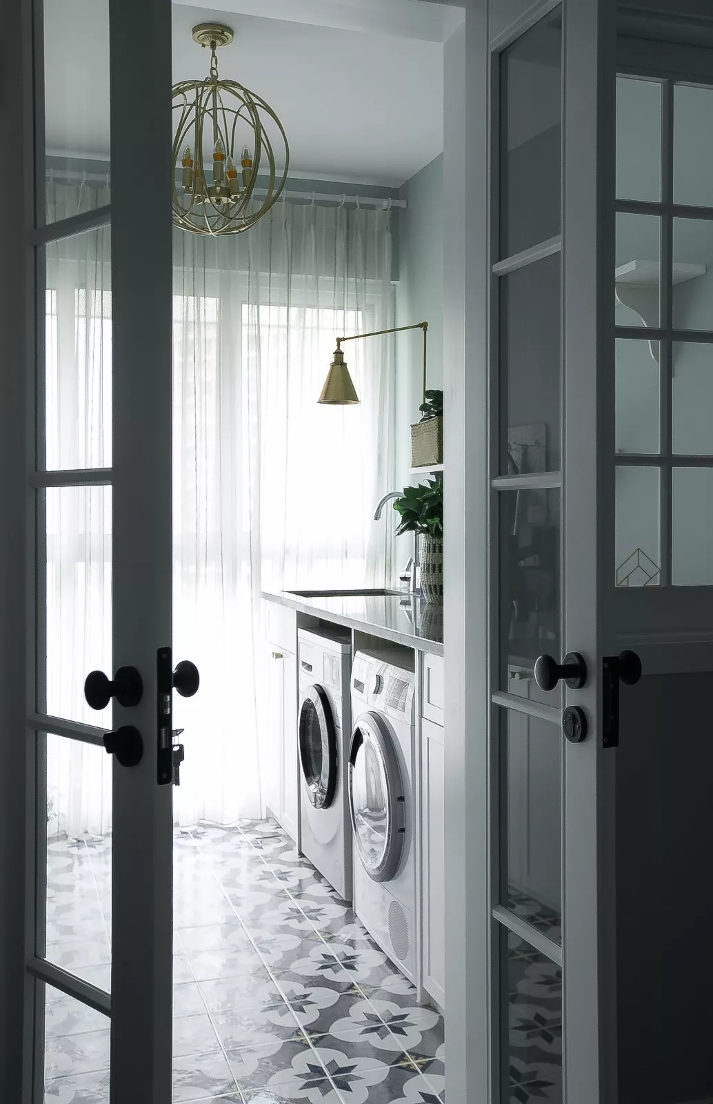 卫浴玄关门厅侧面的阳台洗衣房,一侧是嵌入式的柜子,另一侧把洗手台、洗衣机、烘干机都结合在了一起,实用而又节约空间。