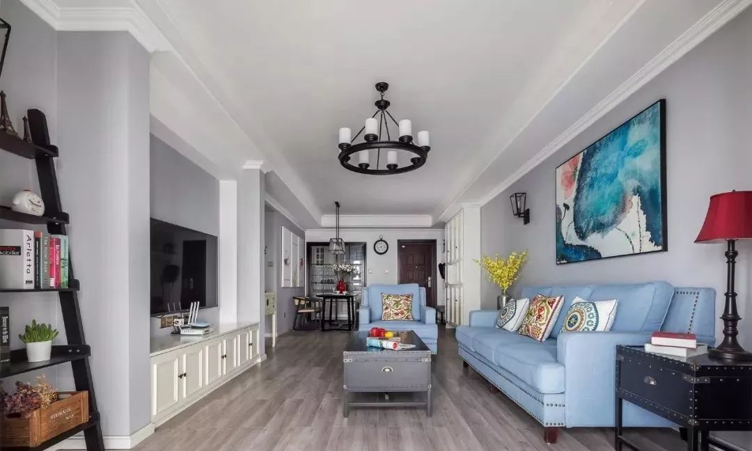 浅蓝和白色相间,比较清新舒适,墙面和客厅一样采用的灰色乳胶漆。