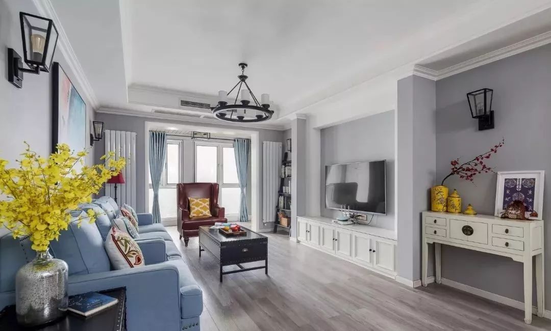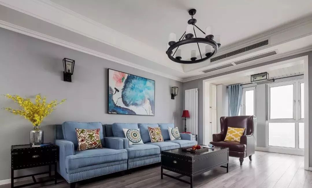 客厅融入了许多美式元素,仔细欣赏细节的时候,你会发现,客厅的沙发、沙发旁边的柜子,茶几,都是偏美式的,棕色的单人皮质沙发,还有点复古的感觉。