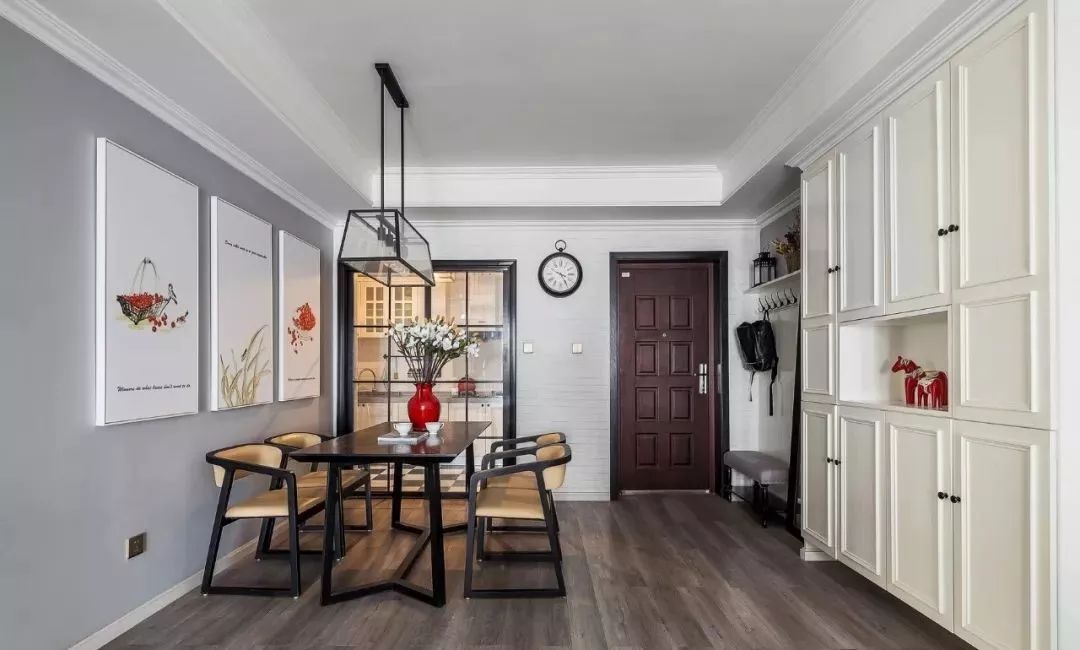 玄关进来就是餐厅,餐厅和厨房用一扇透明的玻璃推拉门隔开的,这样有利于家人们之间的交流,一边做饭时,可以随时观察到客厅里孩子的举动。