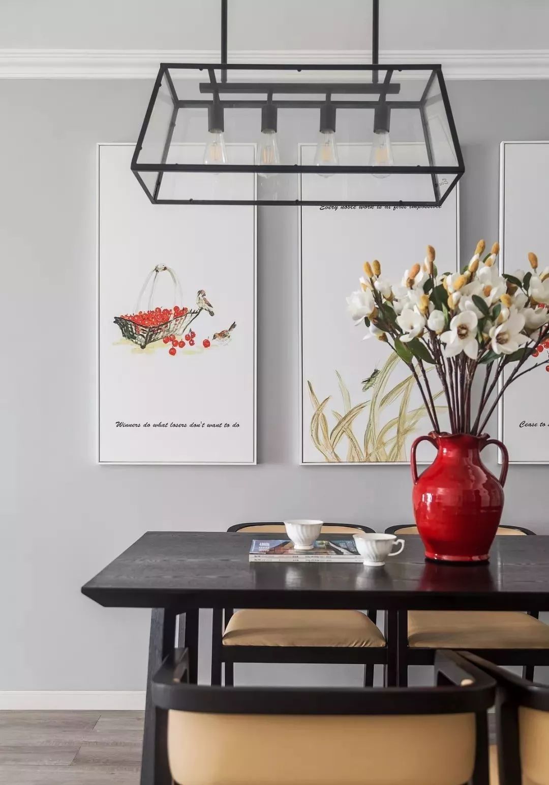 吊灯的造型还是比较复古式的,红色的花瓶颜色浓郁鲜艳,卡其色的皮质餐椅,显得很有质感。