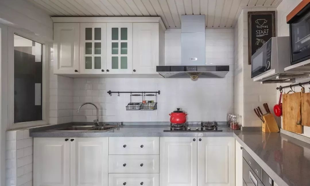 厨房以白色为整体色调,墙上的瓷砖都是工字铺贴,整体干净大气。