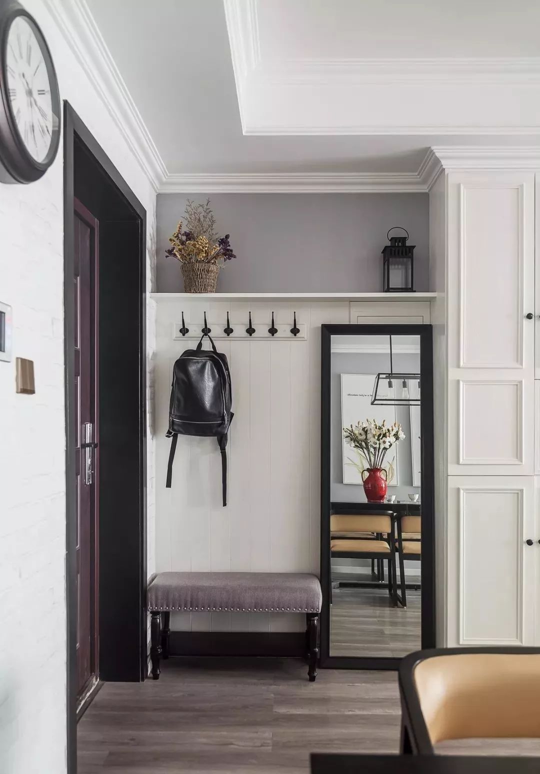 玄关处设计了一个靠墙的小矮凳,矮凳的背景墙上面安装了小挂钩,户主或者客人进门的时候,可以把随身物品挂在这里,出门时随时可以拿上。矮凳旁边是一面全身镜,出门时检查一下自己的着装是否整齐好看。