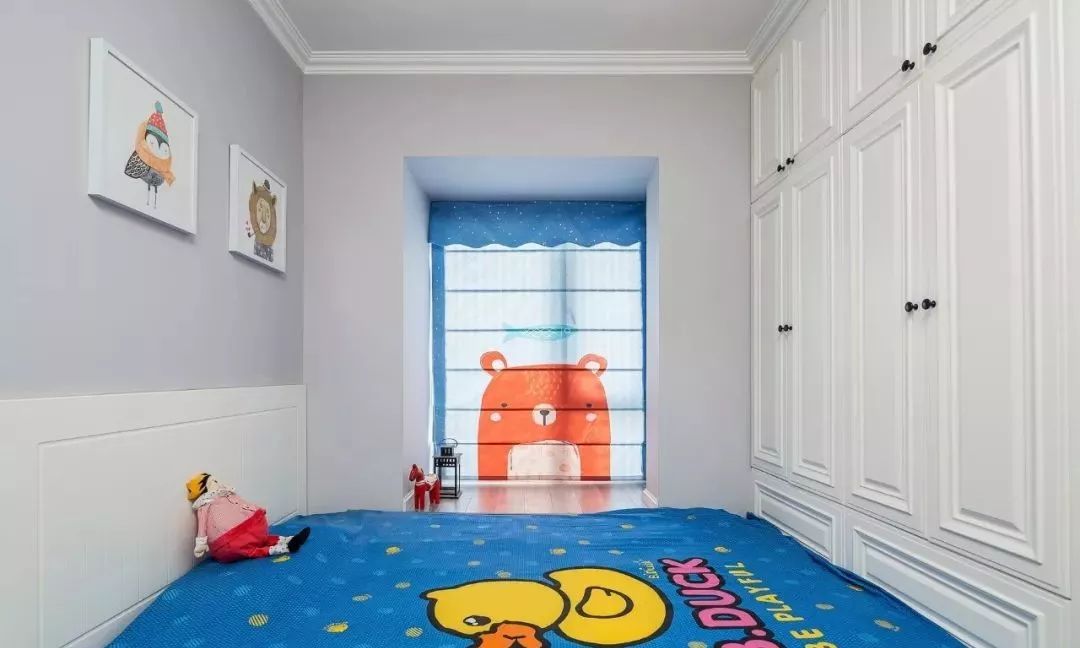 儿童房的床采用的榻榻米,因为晚上怕小孩子乱翻滚,从床上掉下来,榻榻米比较矮一点面积大离地面近,安全性高一些。
