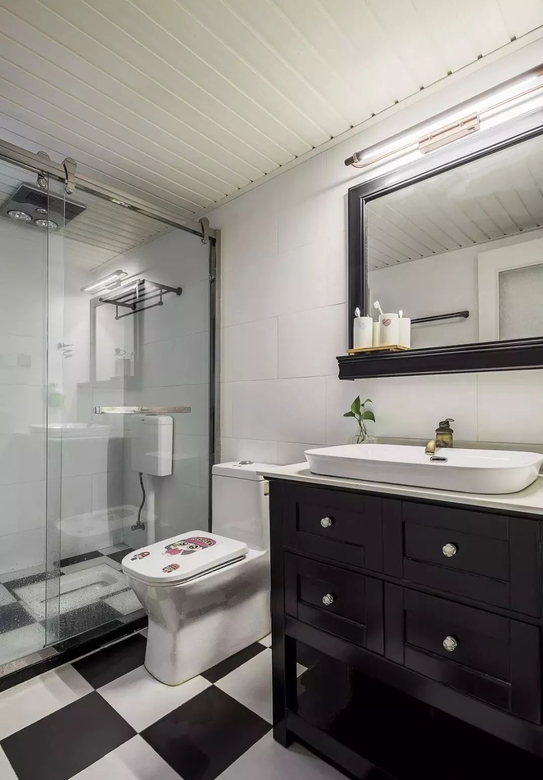 卫生间是经典的黑白搭配,蹲便和马桶都有,满足家人不同的需求。