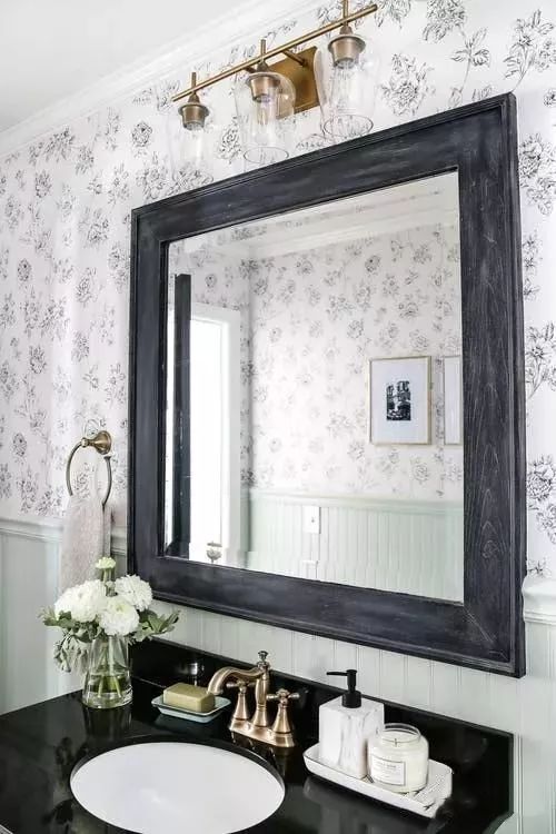 在镜子周围添加基本框架后,您可以进一步装饰,给边框添加上搭配于整个风格的颜色。上图为了搭配洗手台刷上了黑色矿物油漆,跟它以前的白色镜子一个对比,这增加了整个卫生间的深度和质感。