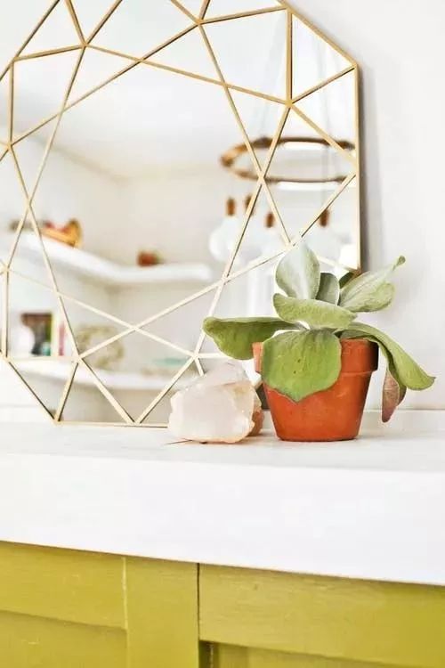 让镜子拥有形状美丽的图案,能变成一件实用的艺术品。如图在镜子上制作了一个带有乙烯基的图案,并用金漆喷涂创造出这些清晰的线条。