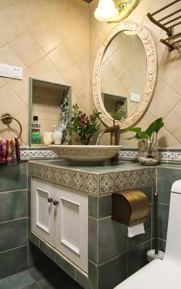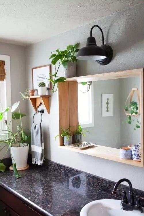 如果你缺少浴室柜,那么可以在镜子四周添加突出隔板,既美观又实用。
