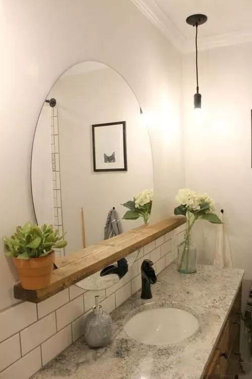 如果你的镜子是圆形的,但是圆形的边框制作费力价格又昂贵。那么不妨考虑图中简单的加一块隔板。既能让空间中得方圆对比,也能让木色与镜子玻璃形成冷暖对比。