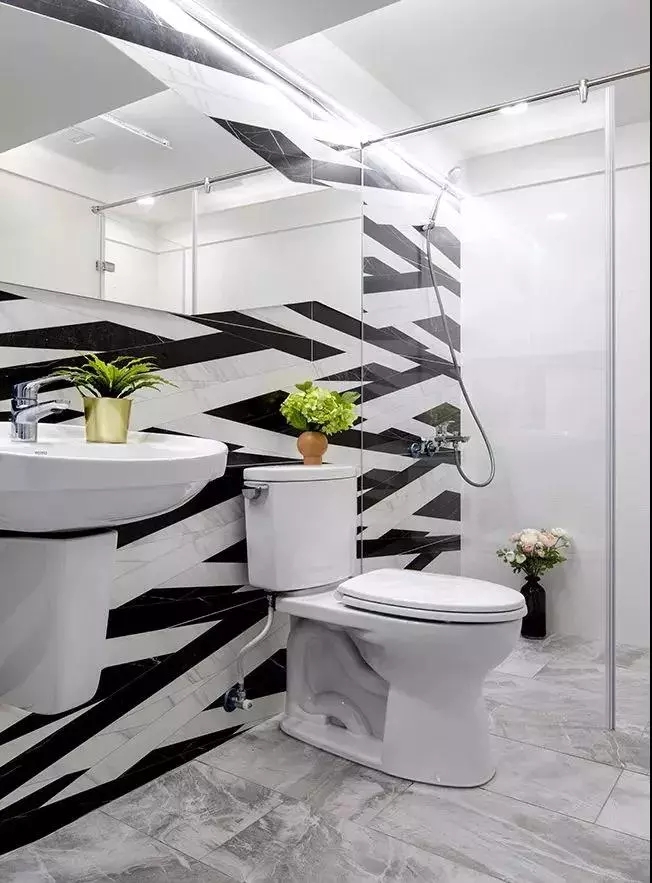 卫生间以白色搭配黑色条纹瓷砖,简约中带着些许复杂。盆栽的存在既净化了室内空气又美化了空间,一举两得。不过唯一的缺点便是没能做到干湿分离。