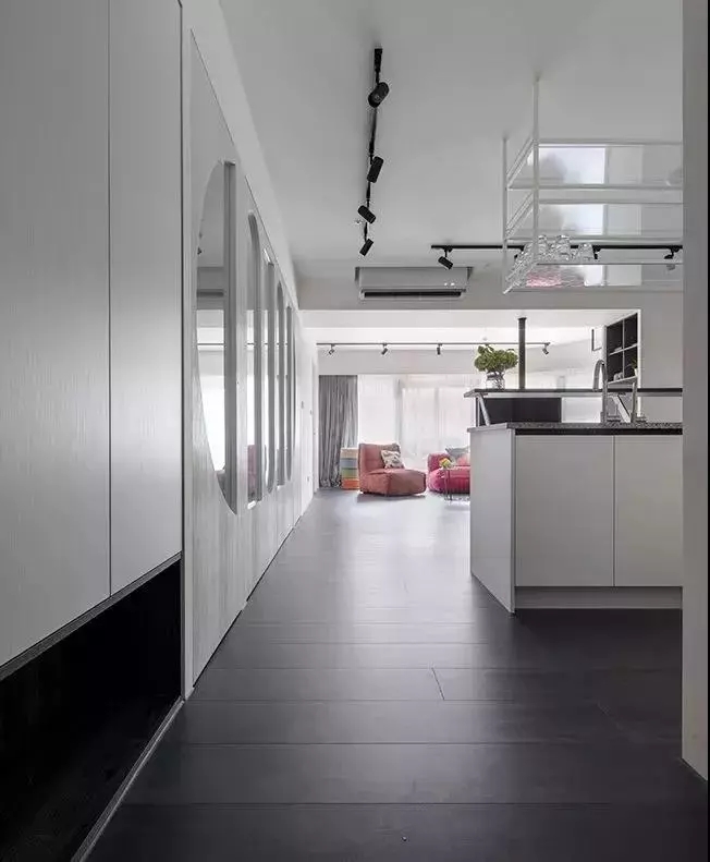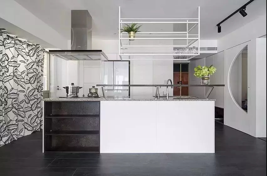 开放式厨房与客厅相互连接,使得空间的延伸感更大。厨房以黑白为主色调,尽显简约大方之感。