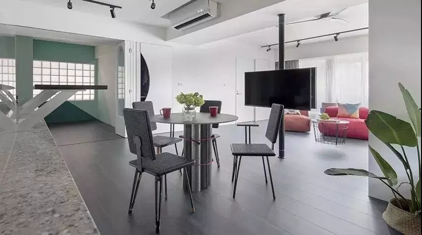 开放式餐厅使得整个空间的视野延伸感更好,餐桌椅与地面色调一致,整体感很强。再摆上一盆插花,尽显温馨的生活格调,最特别的在于电视机的位置摆放的很特别。就餐之余还可以放松心情。