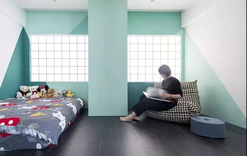 儿童房墙壁用了无比小清新的色调,白绿相间,颜值在线。地砖与客厅色调一致,方便打理。柔软的床上摆放了很多萌萌的小饰品,可爱到犯规。