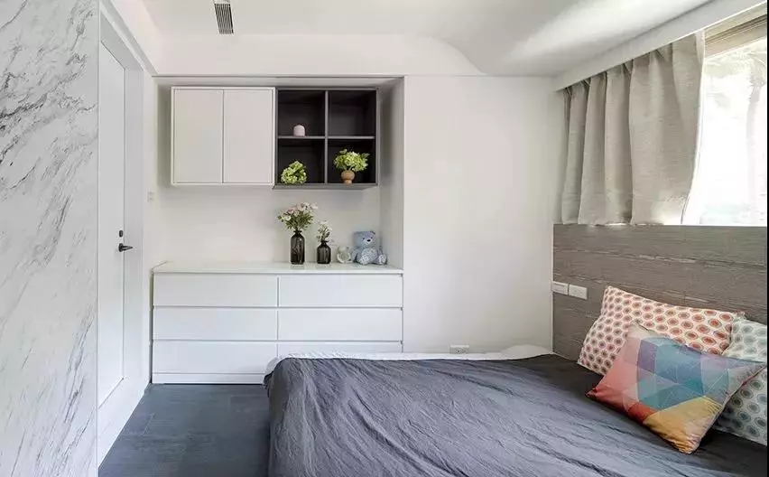 主卧以白色为主色调,简约大方。打造了嵌入式柜子,收藏功能丰富。隐约可见做了时尚大方的吊顶,层次感鲜明,给人以气质端庄之感。