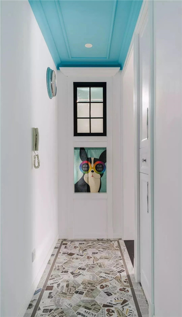 玄关旧报纸图案地砖富有艺术性,搭配地中海蓝吊顶,清新又独具个性。