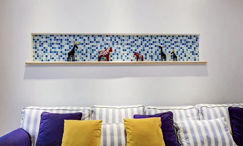 7 、 留白墙面让小户型在视觉上更显宽敞,局部采用蓝色系马赛克打造创意沙发背景