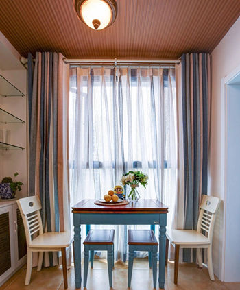 5 、 竖条纹转角沙发与地中海风格的吊灯相呼应,用蓝色调点缀公领域空间