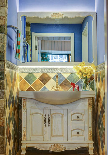 13 、 卫生间干湿分区,半墙拼贴彩色复古砖,搭配蓝调防潮涂料壁面,一组雕花腰线更显精致