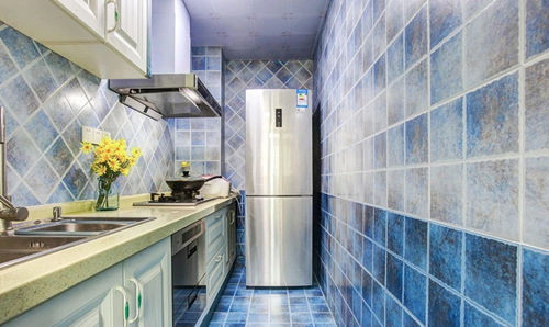 10 、 将生活阳台与厨房整合在一起,节省过道面积,渐变蓝色复古砖打造清凉的料理空间