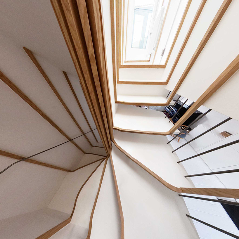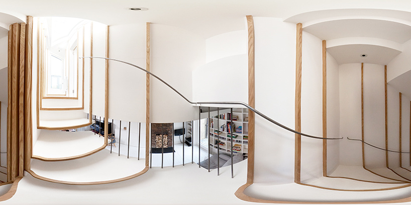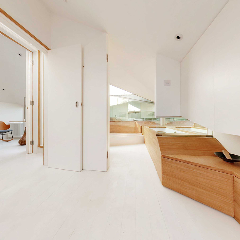 Atmos Studio 伦敦工作室完成了鸟巢式公寓的设计伦敦知名工作室 Atmos Studio “鸟巢式公寓”设计成功处理了空间和光线之间的关系,使原本缺乏空间和采光的公寓发生变化,为即将入住的音乐家兼演员创造了一个灵动的空间,在密集的城市布局中找到了一个小小的切入点。通过最大限度地利用该场所陈旧的主结构,该项目设计以空间,窗户和家具陈设的严密装配为特色,家里的每一个构件都可以同时发挥多种功能。金丝原木细条将处于中心位置的楼梯井的每一个台阶的轮廓勾勒出来,并一直延伸到办公区的书架和生活区。同样醒目的木质装饰构成极富现代感的框缘,一直延伸到每一个堆叠的卧室。这种木质装饰作为一个代表元素以各种形式在室内出现。蝴蝶式双坡屋顶的斜面上有一个天窗,天光通过天窗倾泻到室内空间。该设计反映了客户对日本经济制度下约束和创新的兴趣,也代表了西方世界对于在极小的空间内创造可利用空间的一种响应。交错的楼层将空间进行了细分,创造出更多的空间并消除了折中的长对角线视野,使室内空间看起来更大。白色的墙面将光线反射进每一个房间。与此同时镜子使空间感成倍增加,或者将视野延伸到影响建筑结构体块的一楼。