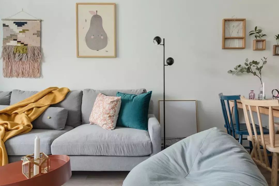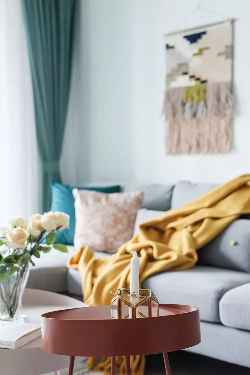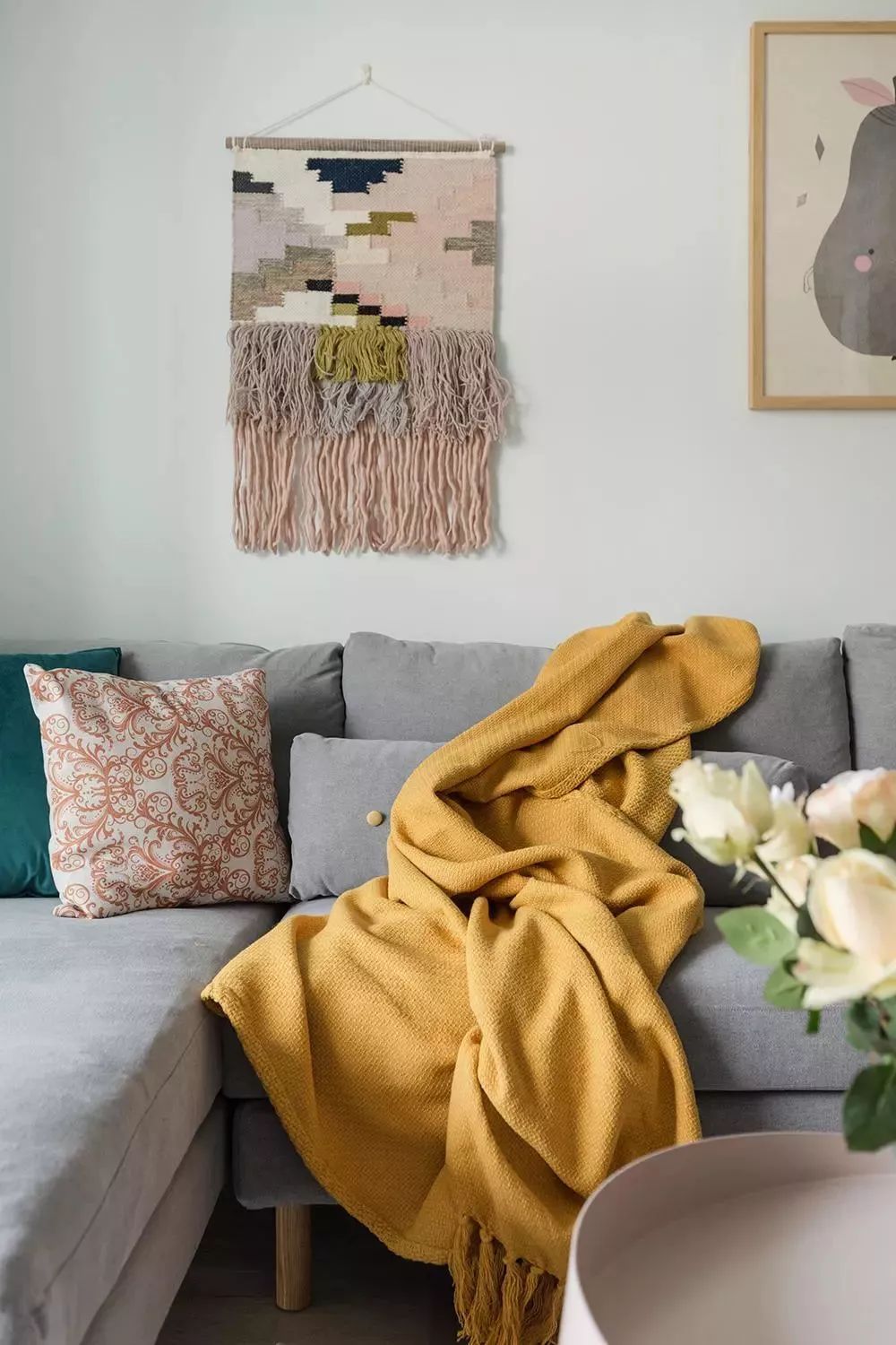 沙发背后墙体用装饰画与挂毯装饰,用温暖的间色迎接阳光的调色。
